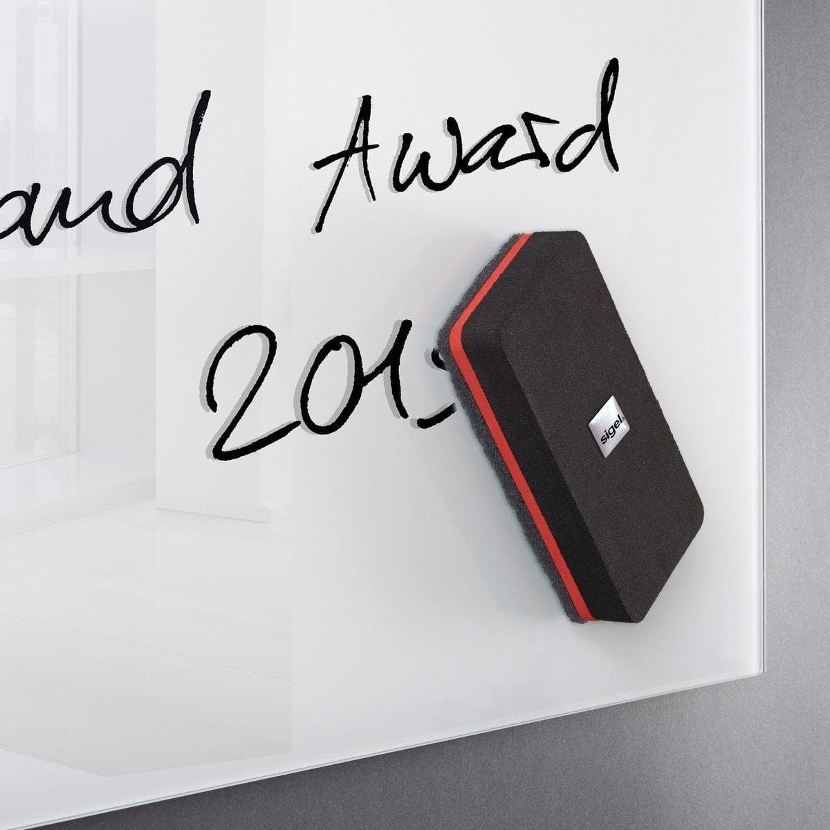 the magnetic board eraser has a contemporary design and quickly dry erases chalk from magnetic glass boards. the specially developed, grey cleaning fleece is gentle on the glass surface and cleans without scratching. the integrated magnet attaches the eraser conveniently to the board where it is needed. perfect for dry erasing and ideal for cleaning the sigel artverum® magnetic glass boards.